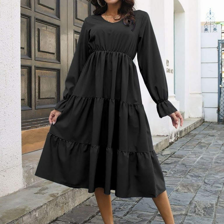 Cocktail Dress Fall Women S Outfits Black Formal Dresses For Women Wedding Guest Winter Plus Size Women S Fashion Casual Solid Color Boho Loose Dress Ruffled Long Sleeve Mid Skirt S Black At Amazon